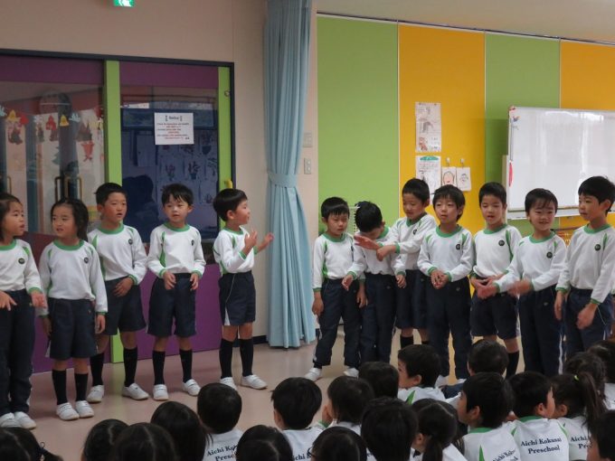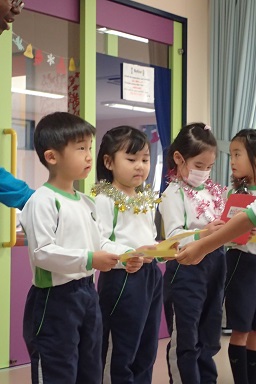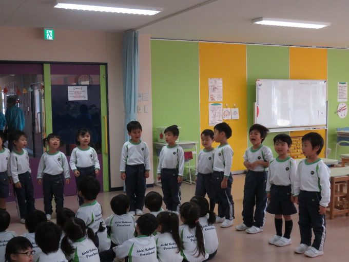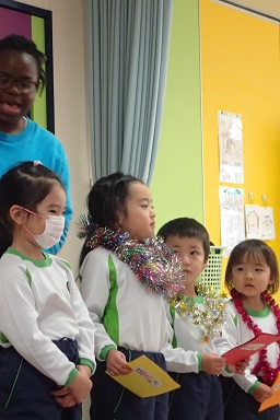 Today, we had a party for students whose birthdays are in December. The birthday kids received cards and leis from their friends and talked about what they want to be in the future. They were very happy when their classmates sang “Happy Birthday” and said “Congratulations”. Afterwards, each class sang the songs they practiced this month. All of the songs had a Christmas and winter theme so everyone enjoyed it.