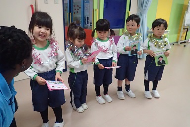 Today we celebrated the April birthday celebrants. First of all we sung birthday song for them and they got their birthday card and looked so happy about it. Then, they sung their monthly English and Japanese songs in front of everybody. And they were so proud to show it to everyone.