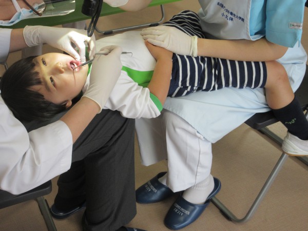 Today, the dentist visited our school. Kids brushed their teeth after lunch as always and lined up to get checked by the dentist. They were able to greet the dentist and open the mouth widely to get checked.