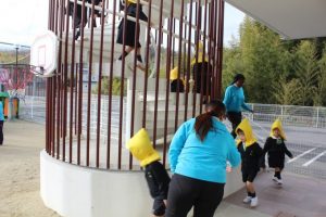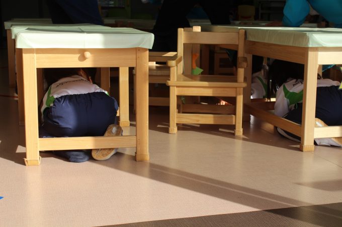 An earthquake drill was held today. The kids were able to protect and hide themselves under the desk.