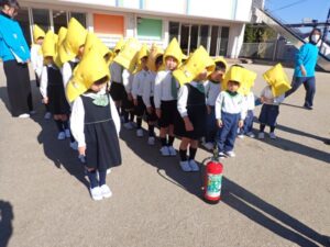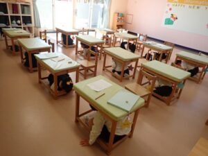 When the announcement was sounded children went under their desks and waited for the next instruction. They were able to evacuate safely with their hoods on to the designated safe and open grounds. They could all remember and recite the “OHANASHIMO” promise.