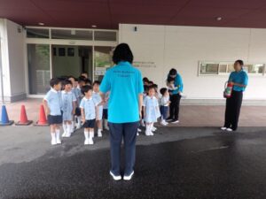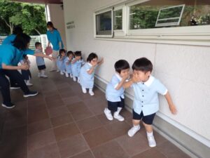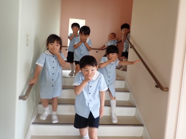 Today we had a fire evacuation drill and an intruder drill. During the fire evacuation drill, the children were able to evacuate by crouching low and covering their mouths and noses. They were able to follow the “O-H-A-N-A-H-S-H-I-M-O” rule. As soon as we finished the fire evacuation drill, a suspicious person appeared, and the children hurried inside and hid. The teacher locked the windows and doors and told the children to hide quietly. The children were able to hide very quietly and were able to avoid being found by the intruder.