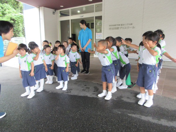 Today, we practiced our fire drill. The fire came from the kitchen. Everyone quickly stopped what they were doing when they heard the announcement. The children covered their mouths, followed the teacher and walked while touching the wall to the safe area outside.