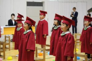 Today, under the warmth of spring sunshine, Aichi Kokusai Preschool held another memorable graduation ceremony for 2024 school year children. Remembering how small they were when they first entered the school, our hearts were filled with emotion at the sight of the confident expressions on the children’s faces as they walk in their beautiful gown and cap to take their seat. Looking back at the days as they grew up, one step at a time, we could recall many smiles, tears, and efforts. I hope that the time they spent at the school will become irreplaceable memories for the children and give them the strength to take their first steps in the new world.