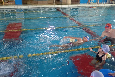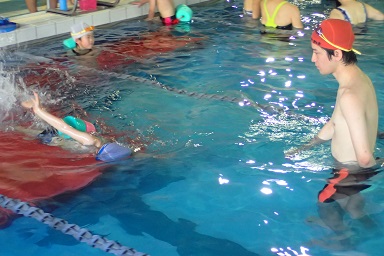 The level 12 class kicked using the floatation device, swam the crawl holding onto the device with both hands, and did a crawl combination.