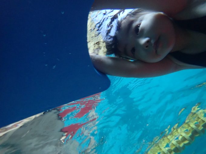 The level 14 class also kicked while sitting down and floated with the board and by themselves. They also kicked using the board with their faces in the water.