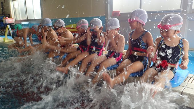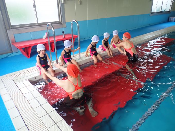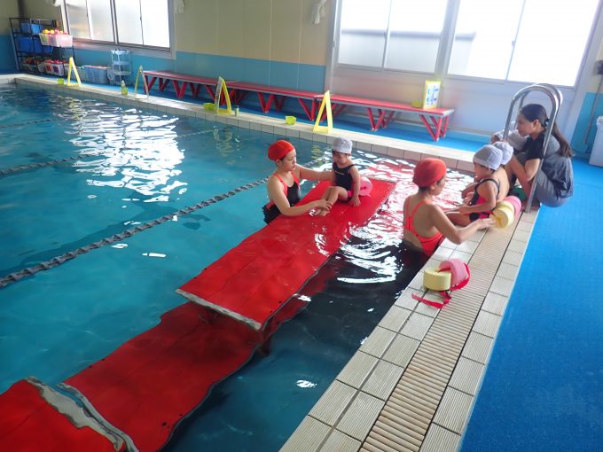 The Frog Class practiced kicking while sitting down and floating in the water using the floatation device.