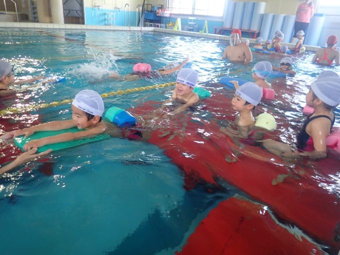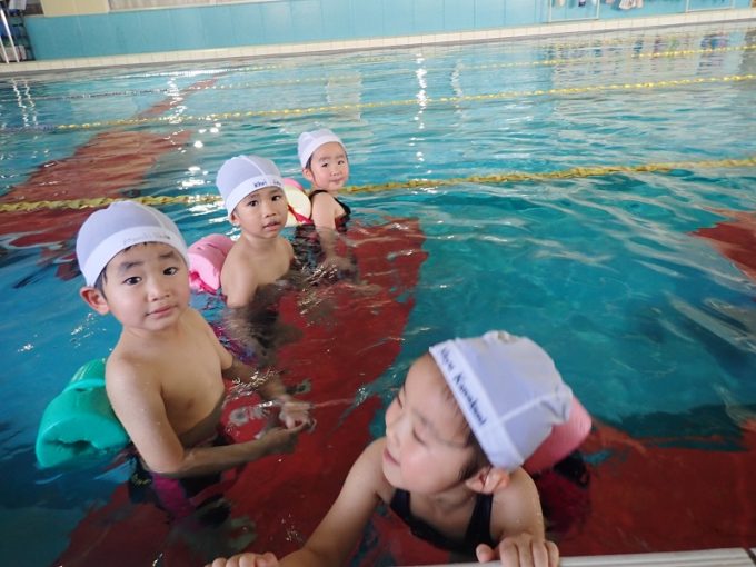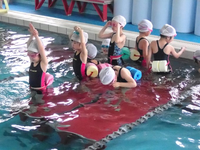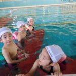 Frog A and Crab B classes did sit kicks, crocodile walk, and wall-held jumps in the water. They practiced floating with coach`s support.