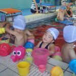 Crab Class practiced crab walk, underwater run, jumping in the water, breathing practice with their face in the water, and slide.