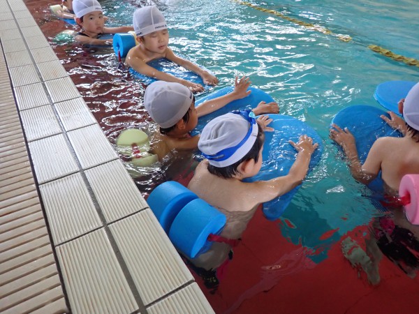 In the frog class, they practiced putting their face in the water and float using a kickboard. They get used to take a deep breath and hold it.