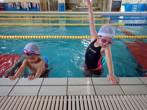 In the 14th grade class, they got used to flapping their feet with a kickboard and were able to work on it with enthusiasm. When floating alone, you could see them trying to swim aiming the goal.