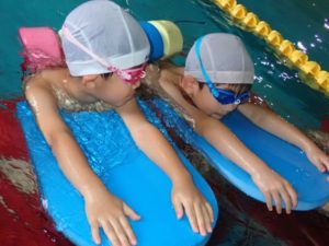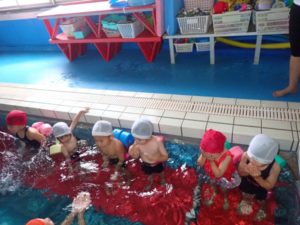 In the crab class, they are getting used to holding their breath underwater, and they are becoming skilled at diving underwater with the coach.