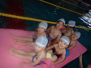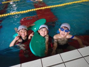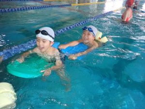 In the frog class, they have become eager to challenge themselves to hold their breath for 10 seconds. They have also started using kickboards and are able to float with their arms and legs straight.