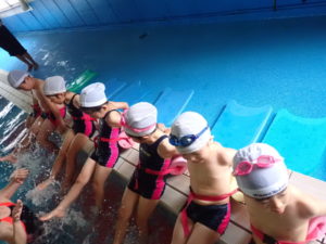 In 14AB class, they practiced to swim while keeping face under water and to swim facing side to side.