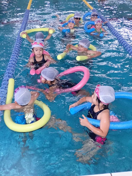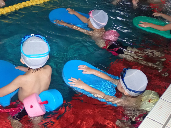 In 14AB class, they practiced to swim while keeping face under water and to swim facing side to side.