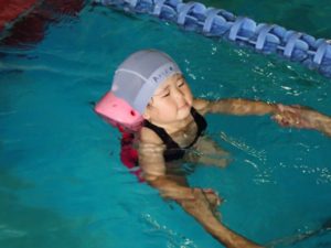 In the 9th grade class, we did the backstroke with a helper. We were motivated to swim 25 meters by ourselves.