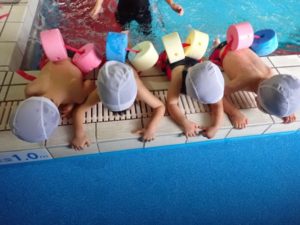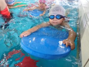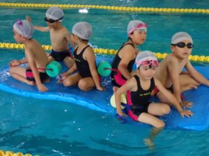 In the Frog class, the children practiced taking a deep breath and floating for 10 seconds. They swam while keeping their arms and legs straight to stay afloat.
