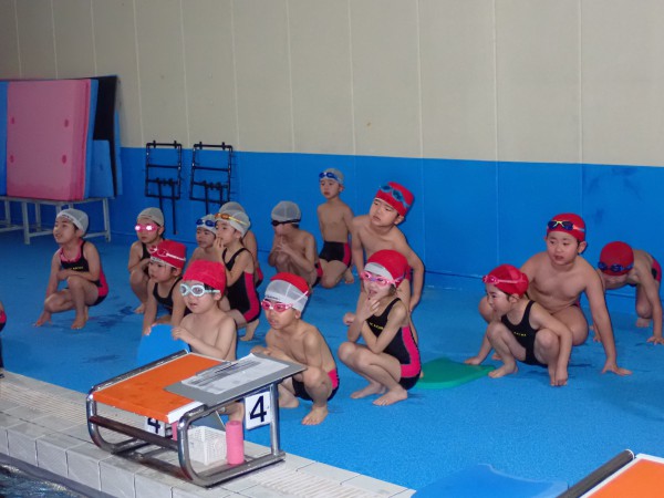Today we practiced for the upcoming swimming meet. After warming up, coach divided them to two groups and kids lined up as coaches guided them to their places. They cheered their friends with a loud voice as it was a real sports day.