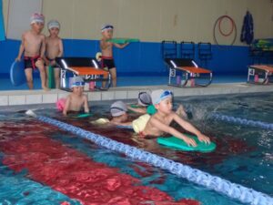 In the mixed class of 14th and 13th grade students, they practiced arm rotation and breathing when swimming the crawl. With the coach’s help and advice, the students were able to turn their faces to the side and take a breath, allowing them to swim enthusiastically.
