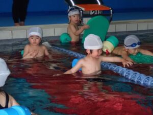 In the crab class, some children got used to putting their faces in the water and were able to dive underwater with their coaches. They became good at crocodile walking and crab walking and were happy to practice.