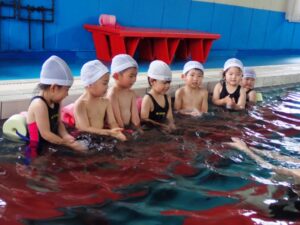 After the general warm up together, the crab class did sit kicks, jumps, face dip in the water, crocodile and crab walks under the water to adjust to the water. They also played with toys in the water. The Frog class did crab walk, jumps, face in the water and practiced foot kicks. The Level 14A class did foot kicks, board kicks, face kicks, and jumps. They practiced flutter legs and consequently did floating by themselves with coaches advices. They tried to keep their body straight and face in the water. The level 14B and 13B practiced face kicks and board crawl with face in the water. They swam enthusiastically keeping good body posture while paying attention to coaches’ directions. The level 11A class practiced floating and swam 25 meters board kicks with face up. Children tried to listen to coaches, follow their instructions and perfect on their swings, kicks, and posture.