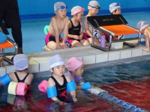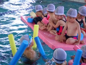 In the frog class, children are getting better at floating, and can now swim with their arms and legs straight and keep their balance.
