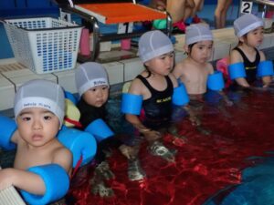 In the 10th class, they swam 25 meters close. They were able to swim without losing their form even when the swimming distance became longer. They also practiced flutter kicks in the backstroke.