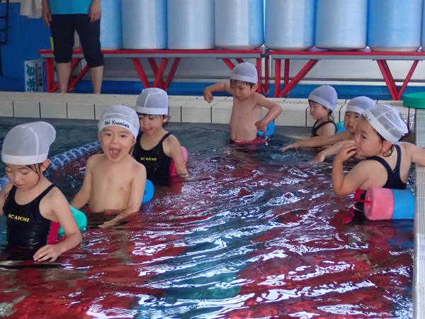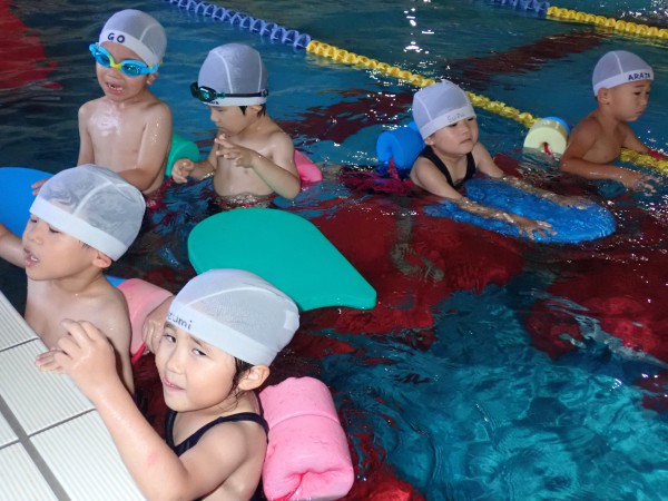 In the frog class, they practiced board floating. They swam while keeping their arms and legs straight to stay afloat.