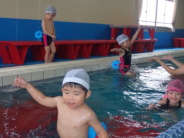 In the Grade 9 class, students practiced backstroke. They practiced raising their arms firmly up and rotating them, and in the attention kick, they practiced floating while keeping their bodies straight.