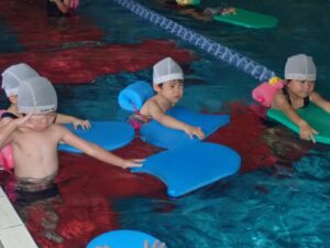 In the 14th class, children practiced floating and flutter kicks on their own. They learned to swim by focusing on kicking the platform firmly to stay afloat. With the coach’s assistance, children were able to swim by keeping their bodies straight and focusing on creating powerful flutter kicks.