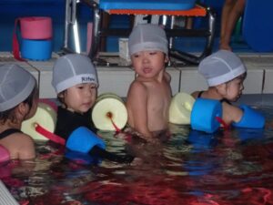 In the Crab class, children practiced underwater walking and face-down swimming. The two-year-olds happily walked underwater with helpers attached to their arms. The older children were able to do the face-down swimming technique with encouragement from their coaches.