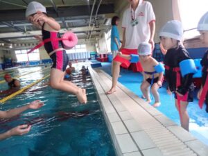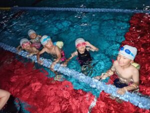 The Level 9 class practiced the hand raising and hand rotation combinations to improve the backstroke. They practiced carefully following the coach’s directions. Children had lots of fun as they swam and played freely in the pool.