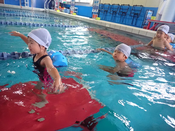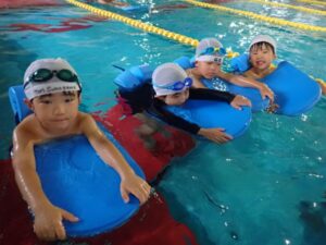 The Level 14 class practiced floating with face in the water. They did board kicks and board floating with flapping legs. Children could gradually float by themselves following the coach’s instructions.