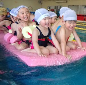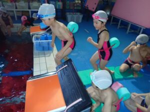 In the 14th grade class, they did foot flapping, floating and board kicks. Children have improved in their swimming ability. Most children could swim 5 meters without the beat board. They swam enthusiastically with the encouragement of the coach.