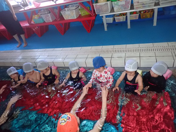 In the Crab class, coach helped children to get used to the water. They did jumping, walking and face-up plank floats. They could straighten their body to floats.