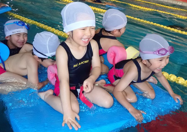 In the 14th grade class, they did foot flapping, floating and board kicks. Children have improved in their swimming ability. Most children could swim 5 meters without the beat board. They swam enthusiastically with the encouragement of the coach.
