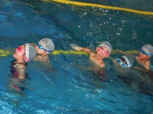 In the Crab class, with the assistance of their coach, the children were able to float with their bodies straight. They seemed completely comfortable with the technique and could be seen laughing and participating in the lesson with their friends.