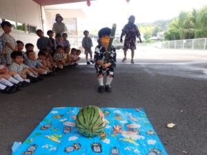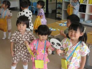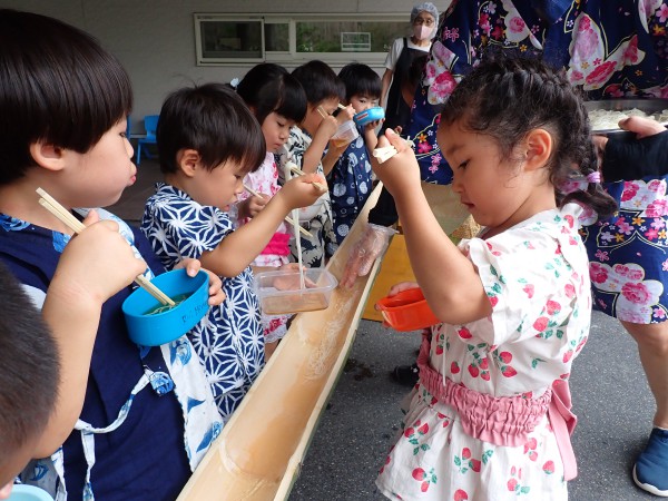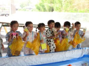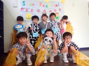 The children came to school in their jinbei, full of energy, and excited by the different atmosphere of the Tanabata Festival. The festival started with singing Tanabata songs, and each class enjoyed festival games, including toy fishing, shooting, lottery drawing, and other activities. In the Nagashi somen (flowing noodles) game, the children skillfully grabbed the noodles with chopsticks as they floated down the stream and ate lots of them. In the watermelon smashing game, the children had fun leading their blindfolded friends to the watermelon by shouting loudly. They received prizes and bamboo with Tanabata decorations that they had made themselves, and it was a very satisfying day.