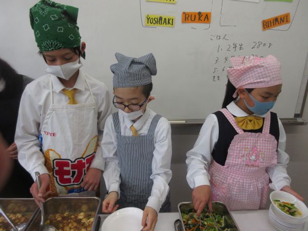 School lunch has begun. From this fiscal year, children will be on duty for school lunches and will be serving and serving school lunches. In order to prevent the spread of the new coronavirus, staff served school lunches in the previous fiscal year. The children are preparing school lunches for the first time in a long time, cooperating with them while struggling. We enjoy school lunch time, which is different from the previous year.