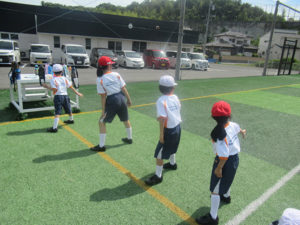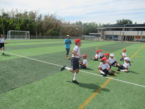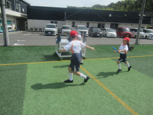 We practiced the relay during our P.E. class. The children practiced a strategy to pass the baton without slowing down. Using the baton pass of Olympic athletes as a guide, they learned to receive the baton while running and shout when passing the baton to each other. In the final race, the two teams finished almost simultaneously in a great competition.