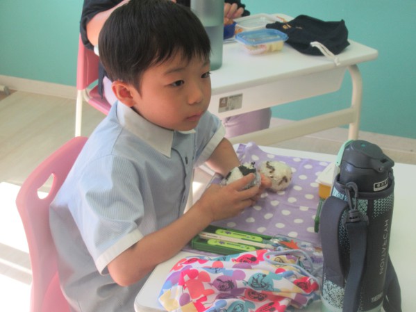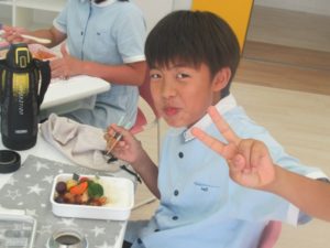 It was bento day for the first time in a long while. Usually, the children eat together with their peers from different grades, but this time they were divided into their own classes and ate with their classmates. All the lunch boxes were filled with many of the children’s favorite foods and were packed full of love. They showed each other their lunch boxes and talked about what foods they liked and disliked, making it an extra enjoyable meal time that they can’t experience during their normal lunch break.