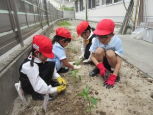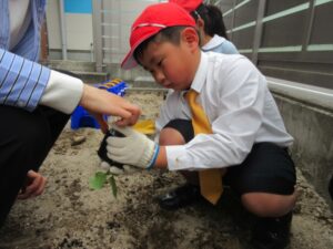 Students observed the shape of the seeds and the size of the seedlings’ leaves, and discussed with each other what kinds of flowers and vegetables they can grow, then, they were seen working with anticipation for the growth of the plants. We are sure they will take good care of it responsibly, watering it every day from now on.