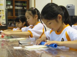 On school trip , we went to Denpark in Anjo City. We took trains and a bus, and it was a great opportunity to learn about manners in public. At Denpark, the children tried their hand at bread baking and making herbarium ballpoint pens. The children had valuable experience that cannot be had at school. It was a day where we made lots of wonderful memories together with our friends and teachers.