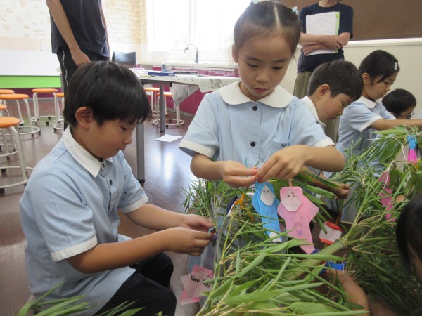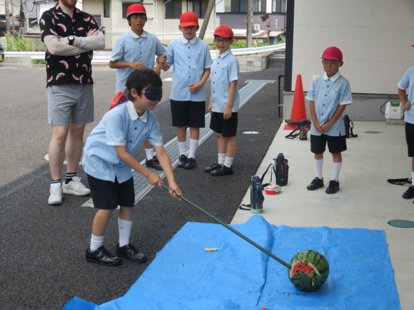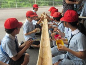At the Tanabata Festival, we enjoyed making decorations for the bamboo, eating nagashi somen noodles, and smashing a watermelon. The students heard about the origins of Tanabata, wrote their wishes on strips of paper and hung them on bamboo, and then had a go at nagashi somen. Some students were able to catch the noodles as they floated down the stream, while others couldn’t, but they all ate them with gusto. The students had a hard time smashing the watermelon, but when they finally did, they cheered and watched as they gobbled it down, blowing away the heat and creating some fun memories.