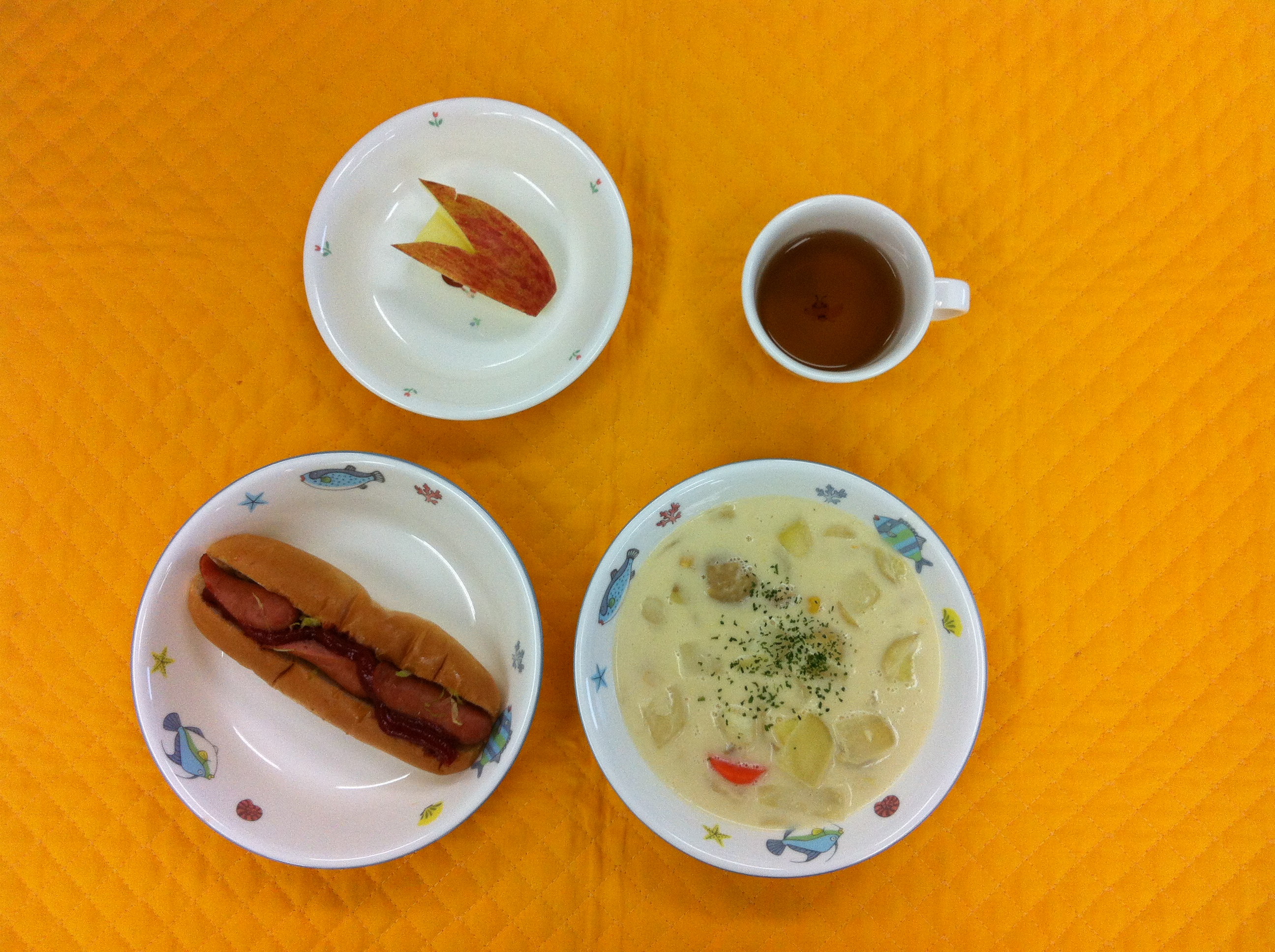 今日の給食は、ホットドックです。炒めたキャベツ、ソーセージをはさみ、配膳する直前に、蒸し器で蒸し、アツアツの状態で子ども達に提供します。みんな大きなお口で美味しそうにほおばっていました。 |