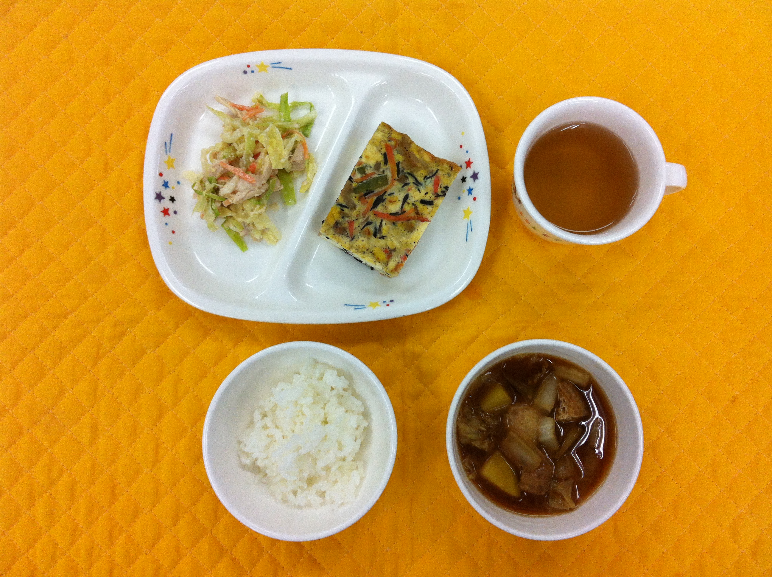 豆腐、卵、ヒジキ、人参、ちくわ、インゲン、しめじが入り、オーブンで焼き上げました。しょうゆとお砂糖をやさしく味付けしました。