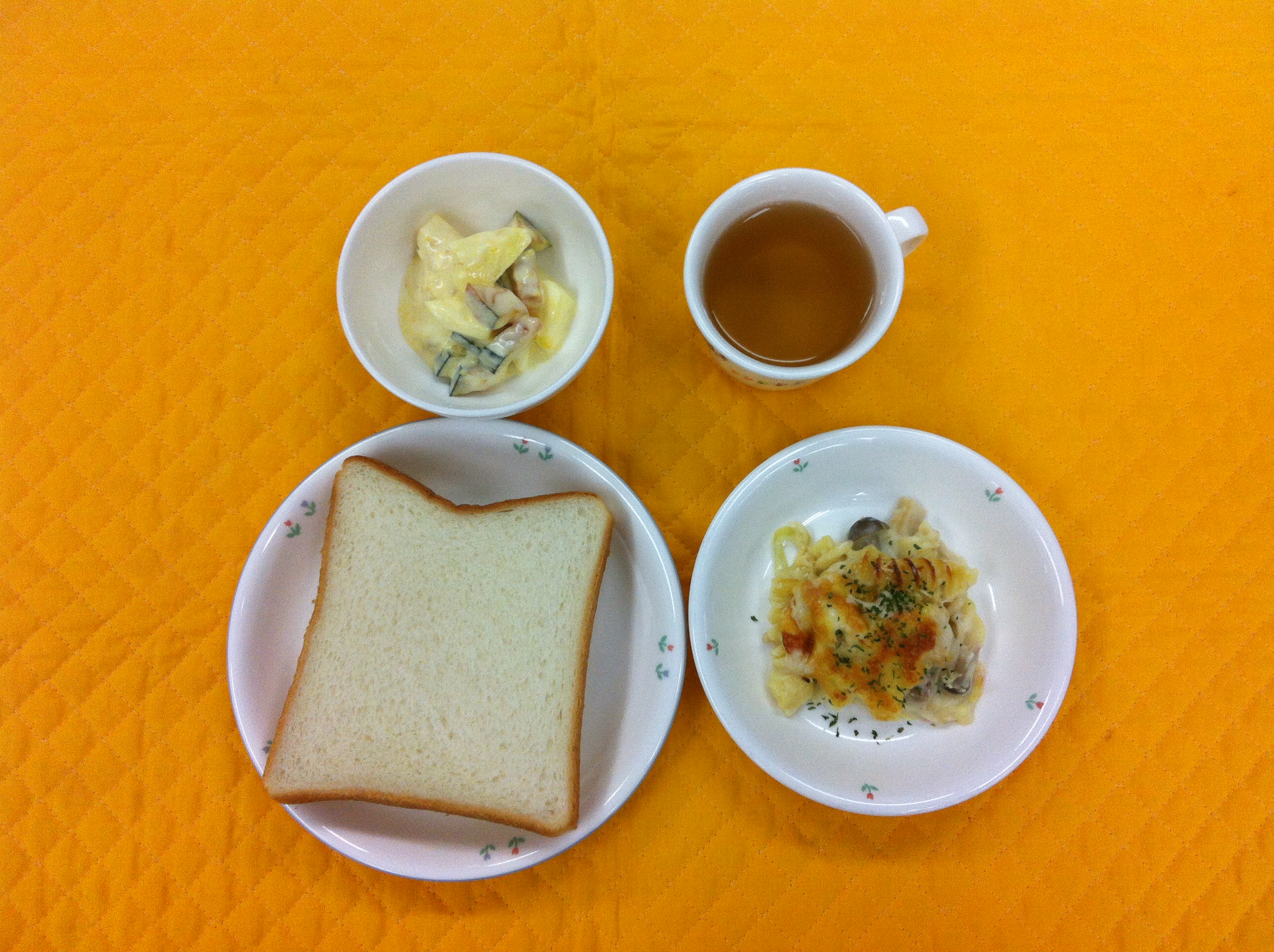 今日の給食は、人気のマカロニグラタンです。サラダは、かぼちゃ・リンゴ・パイナップルをヨーグルトとマヨネーズで味付けしたさっぱりとしたサラダです。
