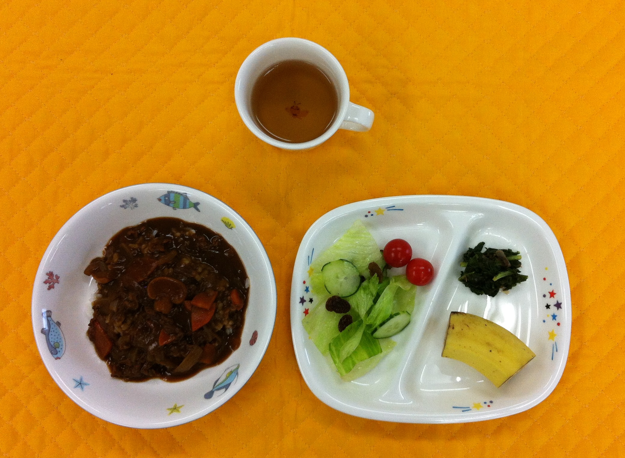 今日の給食は、ハヤシライスです。大人の味のハヤシライスは、子どもたちにいつも人気です。今日の副菜に出された『大根の炒煮』は、子どもたちが園内菜園で育てている大根のぬき菜を使用しています。