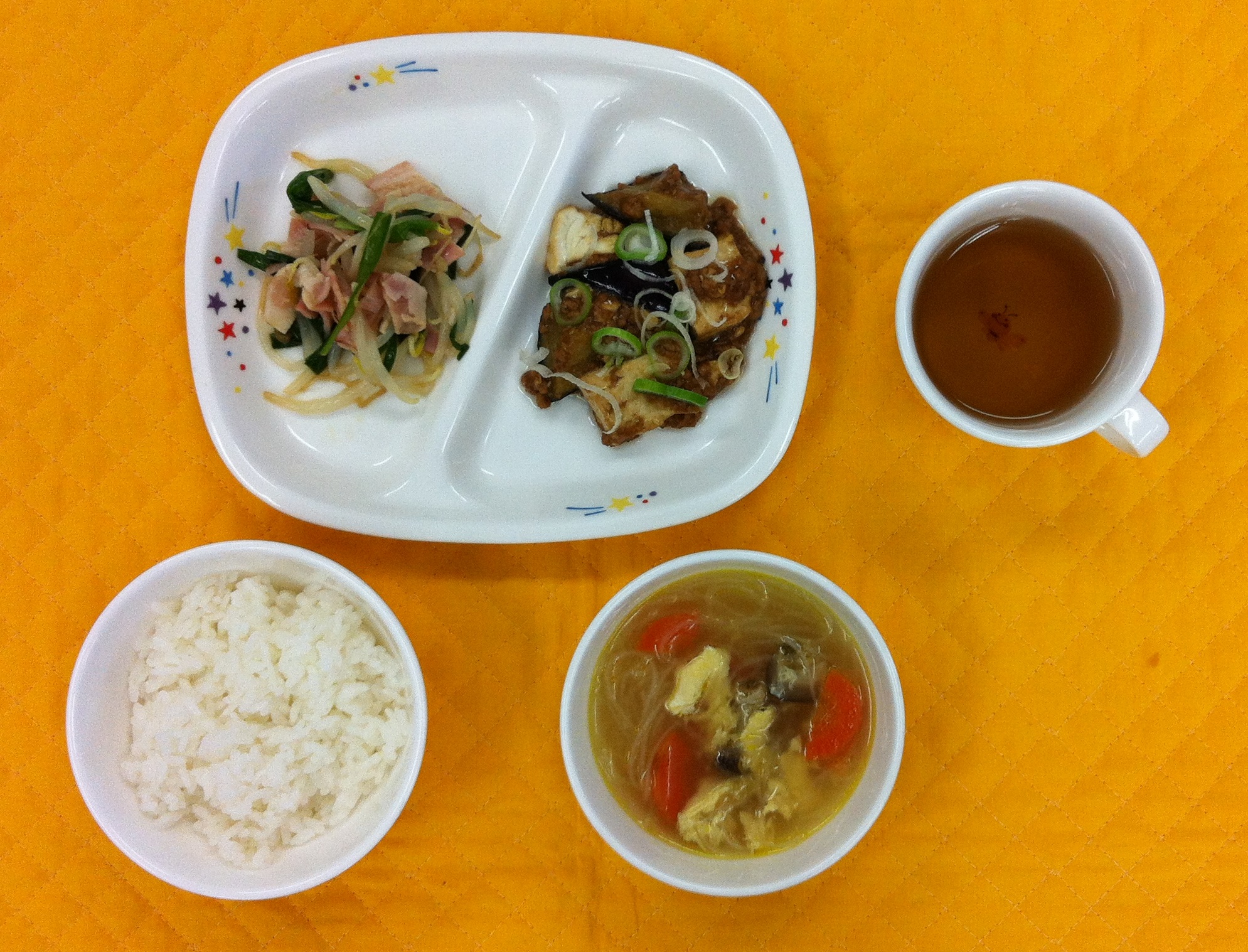 今日の給食は、麻婆ナスです。今日の給食は、野菜がたくさん入っています。お野菜たっぷりで、風邪を引きにくい体づくりをしよう。 |