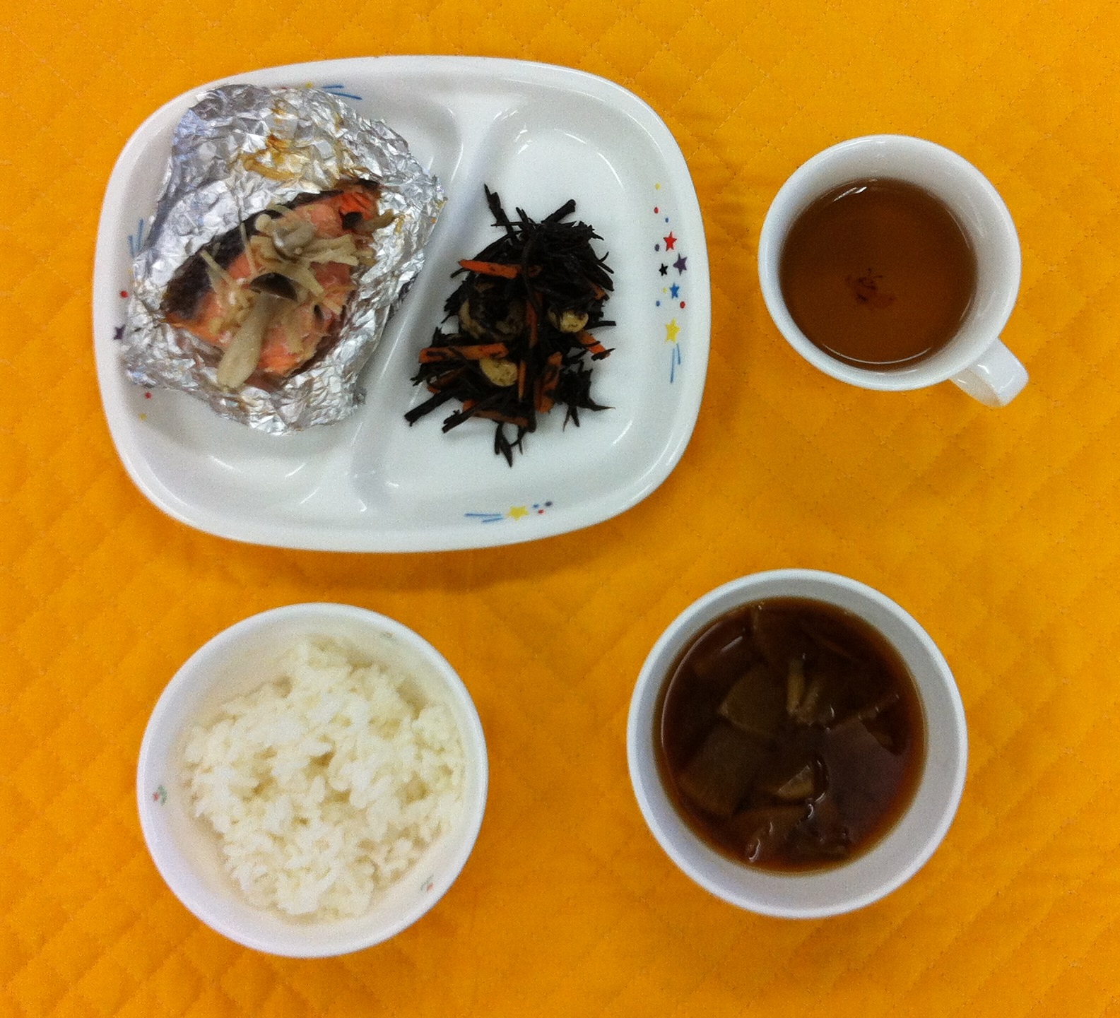 今日の給食は、鮭ときのこのホイル焼きです。鮭ときのこのホイル焼きは、キノコと鮭をバターで焼いたものです。秋冬に美味しい一品です。 |
